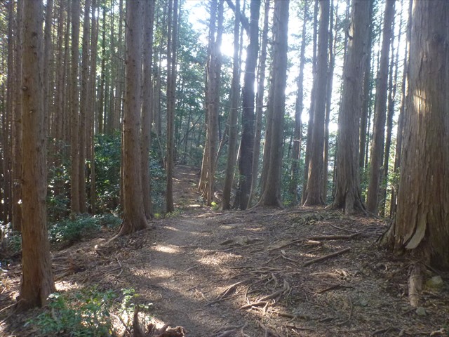 小床峠へ杉桧林に広い道が伸びる、びっくり