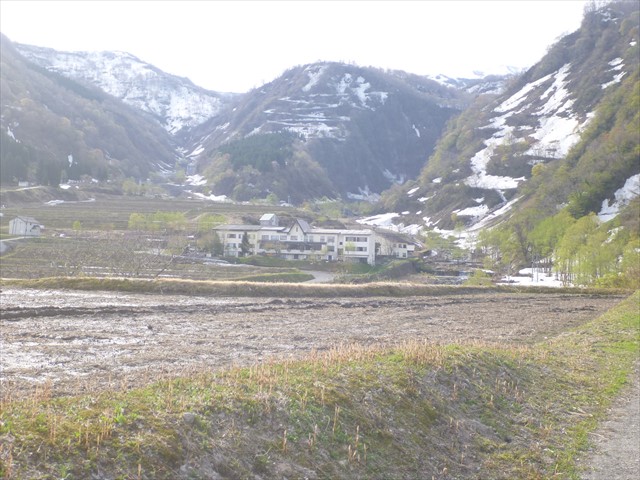 土筆の土手の先に笹倉温泉を望む