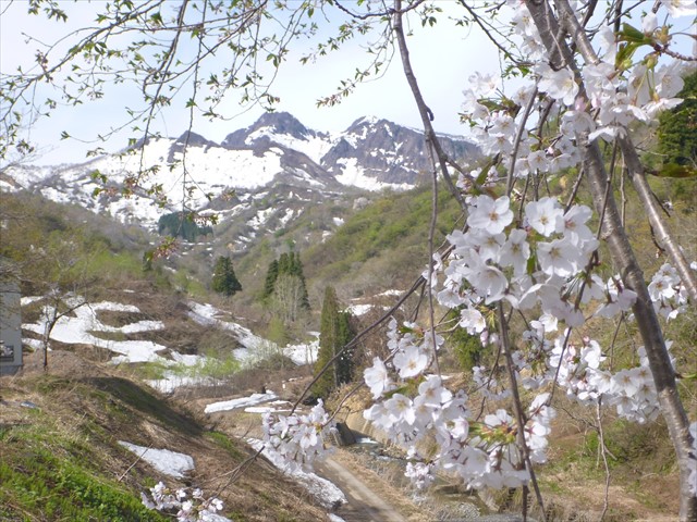 焼山温泉のソメイヨシノの花の向こうに阿弥陀・烏帽子