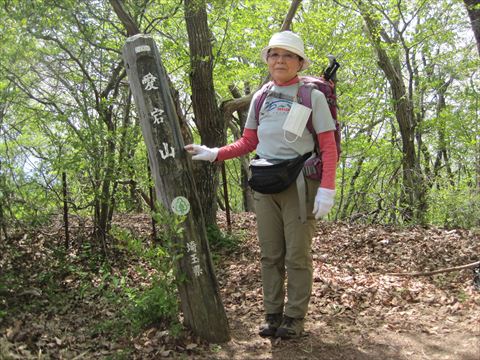 愛宕山到着、帽子から下げたマスクが、で~んと目立ちます