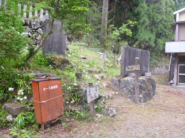 階段横ホース格納赤箱の右に登山道入口と神山道標、シャガの咲く道へ