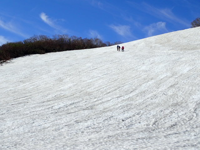 まづ、最初の急雪渓を登山班が先行していきます