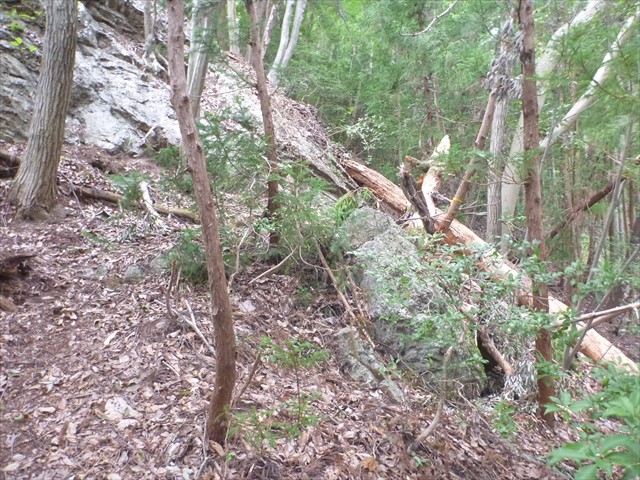 岩場巻道を塞ぐ赤松倒木を振り返る