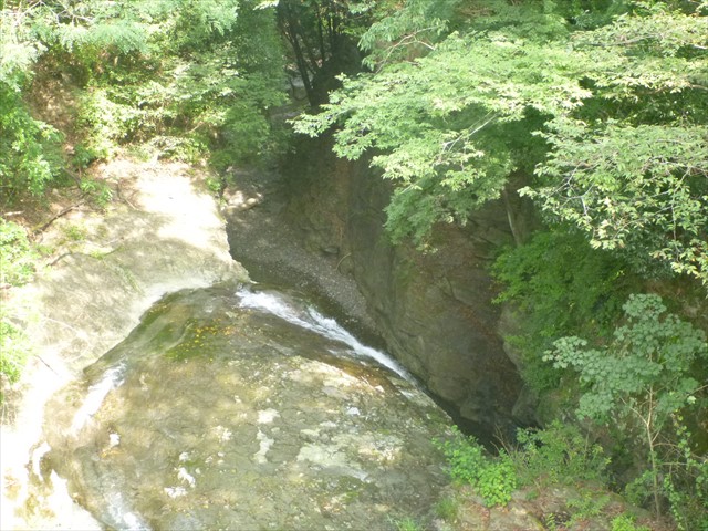 子の神の滝を橋の上からのぞく