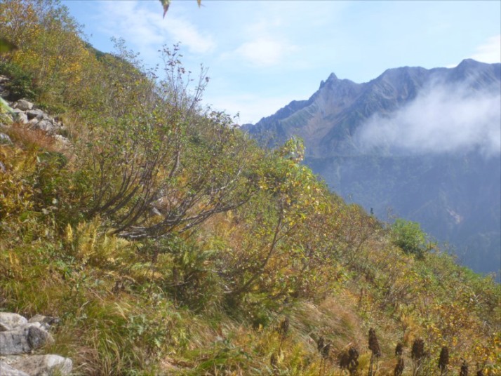 黄葉始めた斜面の先に槍ヶ岳西鎌尾根、靄が雲に変化