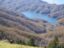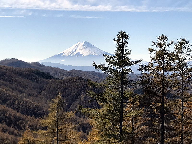 緊急事態宣言も解除になり県外の山にも行ける、秋晴れが続き、紅葉も見頃となって、考えることは皆同じ。甲斐大和駅に着いて仰天した!見たこともない長蛇の列!!最後尾はどこ??状態! 混んでも栄和交通バスは臨時便を出してくれるとたかをくくっていたが、40分待ってもバスは来ない!たまらず、他の人が予約済みのタクシー運転士さんに無線連絡してもらい予約した。 暫し待ち、やっとタクシーが来た。予定のバス時間より1時間遅れて出発。ほっとする。 今日の行程は充分余裕があるので、慌てることはないが、帰りの終バス(16時)が満員で乗れない恐れがあるので運転手さんに「すずらん昆虫館前に16時の予約を入れてもらった.ヤレヤレ! これで安心して出発できます。 歩き出して間も無く林道に出るとすっきりと大きな富士山が見える。素晴らしい! 山道に入っても富士山と一緒。カラマツはもう葉が落ちていて残念! 笹原の道になり石丸峠に到着。多くの登山者が行き交っている。牛の寝通りへの道を分け下方に大菩薩湖を見て富士山の後ろに南アルプス連峰が連なり、雪を被っている山もあります。 小金沢山の手前でランチ。暖かくなんと良い秋晴れでしょう。Oさんお手製のイカめしをとても美味しく頂きました!反対方向の湯ノ沢峠からの登山者もすれ違い、小金沢連嶺の登山道はいつになく賑わっています。 小金沢山の登りは、満腹のお腹を抱えて少々しんどく、牛奥ノ雁ヶ腹摺山の山頂では富士山の中腹に雲がかかり始めました。 下山は紅葉のオンパレード!であまりの美しさにため息が出てしばしば足が止まりました。 下山のバス停にはタクシーが待っていて、予定通りの時間に駅へ。 緊張を強いられる所も無く、富士山と紅葉をゆったりと楽しめた秀麗富嶽12景の山行でした。