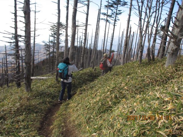 下山にかかるとすぐ、何故か立ち枯れの木が多いです