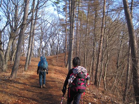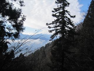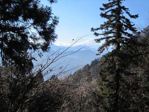大久保のコル、稜線に出ました。木々の間から山々が。