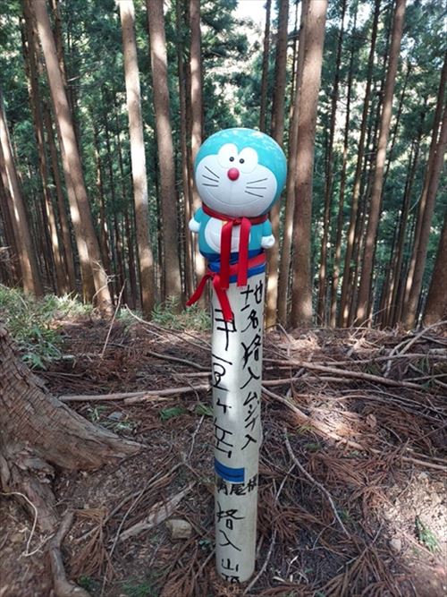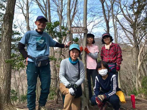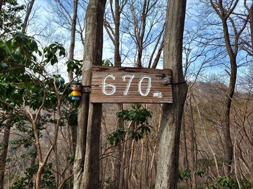 本陣山とイモリ山の登山道分岐である森坂峠を下り車道へ出て、取り付きの琴平神社を目指します。途中ミソサザイの声が聞こえ、かわいらしいフクジュソウも咲いていて初めて歩く道にわくわくしました。琴平神社からは尾根道を歩いて行きました。急登はあれども、地図を見ながら現在地を確認したり、遠くに見える山を眺めるだけでなく川越山や関八州、カバ峠と特定したりと楽しい道のりでした。途中、ドラえもんやのび太の人形がお出迎えしてくれたのには驚くとともに心和みました。バラカ平の近辺ではシジュウカラやエナガなど鳥がたくさんいて鳴き声が心地良かったです。