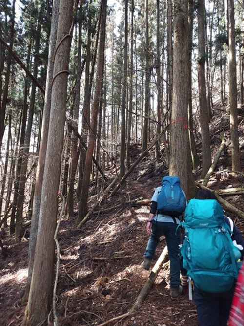 今回急登よりも大変だったことは花粉症でした。私は日頃それほどひどくない花粉症なのですが、オレンジ色に染まる山々の中ではやはり敵いませんでした。マスクをしていてもくしゃみ鼻水がひどく、翌日は更に大変でした。Sさんは至ってはもっと大変そうでした。(Y.K記)