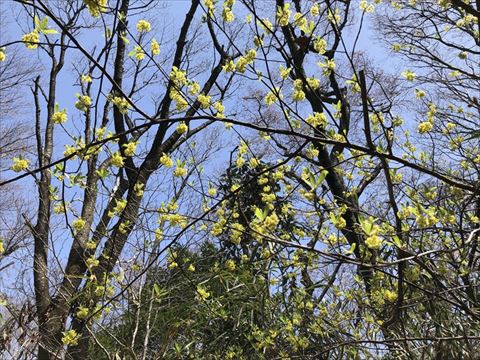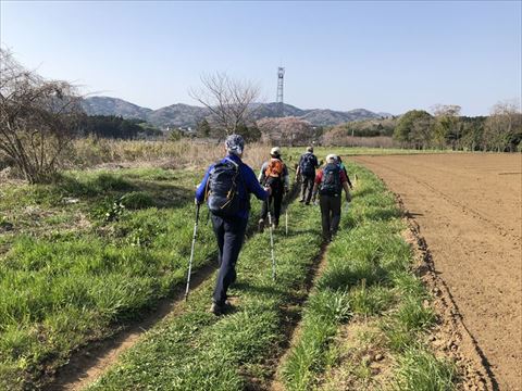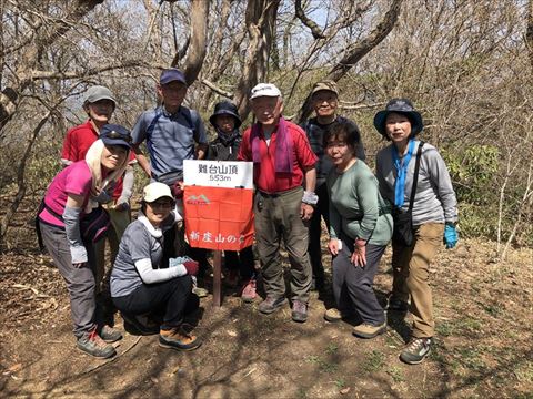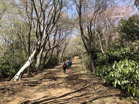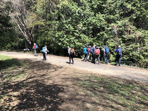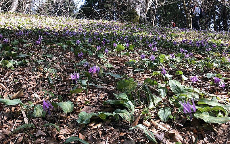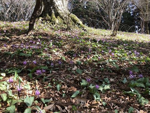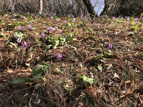 早朝、往路の車窓から、今から歩く里山の稜線を眺めながら、ワクワクしていました。登山道は、思いの外に歩き易く、アップダウンの連続でしたが、皆さん良いペースで歩き続けました。快晴に恵まれ、気温も上がり、小まめに水分を補給しながら、新緑の里山ロングコースを楽しみました。下山途中には、斜面一面にカタクリの群生地があり、紫色の花が無数に咲いていました。 (M.Ts記)