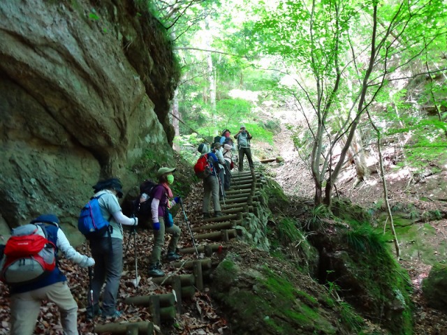 大きな岩の横の階段を登ります