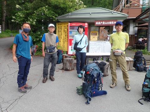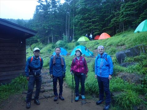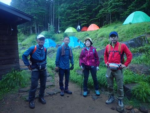天気も良い方に向かい、リーダー部テント山行八ヶ岳連峰縦走できました。Moリーダーが予約してくれた時間もお値段もお得な富士見駅からのタクシーに乗り、美濃戸口からの肩に食い込むザックを背負いいざ出発。シラビソ、コメツガの針葉樹林に苔が美しいこれぞ八ヶ岳という森を行く。北沢を歩き3時間で赤岳鉱泉に到着。かなりの人出です。早速テントを張り、3張設営完了。そのあと雨になり間に合ってよかった。夕食はMoリーダーの炊き立てご飯にビビンバ、Miリーダーの網焼きソーセージに手作りウズラ卵。美味しかった!