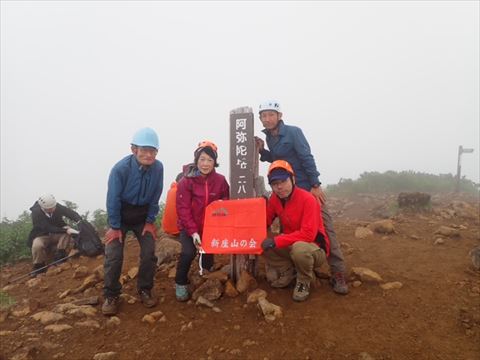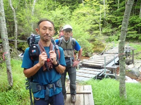 3日目5時出発、今日は行者小屋先の分岐から阿弥陀岳に向かいます。ヘルメット着用し、ザレた岩場で落石に注意しながら三点指示で慎重に岩を登ります。イワベンケイ、イブキジャコウソウ、イワギキョウが咲いていました。7:10阿弥陀岳登頂。中岳のコルで富士山の頭が雲間から見えました。全員ホッとしてしばし眺めました。テント場に戻り撤営し、来た時よりは軽くなったザックを背負い美濃戸口まで戻り、入浴後さっぱりとして帰宅しました。