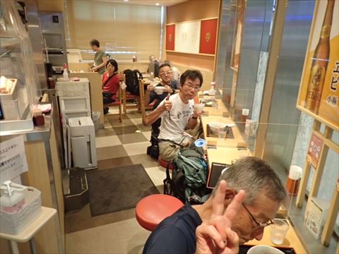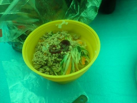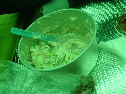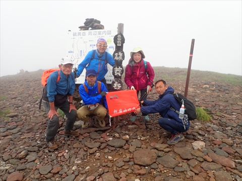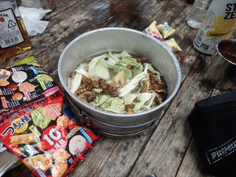 硫黄岳山荘で休憩をして硫黄岳登頂!本日3個目の山。テント場に戻り夕食前の晩餐開始。またリーダーの準備してくれた乾燥野菜たっぷりスープ、網焼きアジとハーブソーセージ。