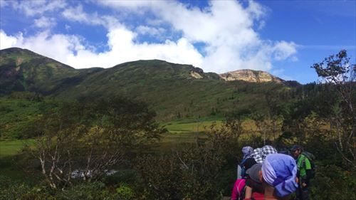 火打山頂まで右側に見えている稜線沿いを歩いて行きます。山頂はまだ遠い。。