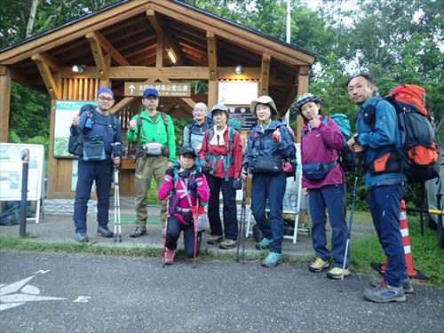 2日目、朝6時に出発。火打山の登山口でパシャリ。