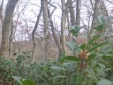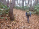 薄ら寒い中、昼食を終えて引き返す。再び落葉の絨毯を踏んで幅広い山道を下る。麓から正午の音楽が流れた。落葉松・赤松・黒松の林を下る。広葉樹林の斜面を巻いている道に帰って来た。山側にはシシガシラ、林床にはユズリハの緑も目立つ。尾根道の山頂道標が立つポイントを過ぎて巻道に、巻道を終えて谷を下り杉林に帰って来た。見下ろせばふれあいの森駐車場が目の前にある。ふれあいの森学習路登山口の橋を踏んで溝・穴だらけの舗装道に立った。ここがネット情報の舗装路出合であると実感する。落葉で覆われた林道をどんどん下って大仏山登山路進入禁止のゲートに着いた。墓地駐車場の車に帰ってまずは荷物を積み込んだ。