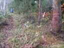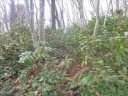 墓地駐車場を出発してR121旧道に出た。ナビに従ってR121新道を経てR49、次いでR111等を経た。11/4~5に通ったばかりの会津若松駅前を過ぎ幾つもの電波塔が立つ背炙山を目指す。武家屋敷、松平家墓所を横に見て東山温泉の背炙山登山道に入った。久曾神さんが選んだ羽黒山登山口は車道と地形図破線(石山徒歩道)との接点(等高線590m)である。ここは二つの道の峠かつ羽黒山と向かいの山とのコルになっている。頂上までの標高差は55mに過ぎない。車を道脇空き地に停めて空身で羽黒山へ踏み跡を登った。杉林の中、薮の踏み跡を辿るとなんと境界巡視路に出た。目印テープ、赤杭迄もある。羽黒山南尾根まで巡視路を辿った。道が下りになったので少し引き返して右手(北)の薮斜面に取り付いて頂上を目指す。ミズナラ疎林で林床の薮は椿である。こんな椿薮は二王子岳以来だ。久曾神さんに続いて密薮をかき分けて登った。山頂部は平坦であるが一面椿薮が広がっていた。最高点645mを示す山頂標も目印テープもない。何もないのでGPSロガーが表示する標高の最高値の地点で薮漕ぎを止めた。ミズナラ林の薮の中、展望も全くない。南東へ獣道・水流跡を探して薮漕ぎしながら巡視路まで下った。巡視路を引き返して車道に出た。車道法面に巡視路の入口らしい山316マークあった。取り付きの目印になる。