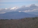久曾神さんの背を追って大仏山の頂上に到着した。目前には涎掛けをした石の小仏が座ってこちらを向いている。手前には三角点(708.2m)がある。その右手下には北に向かう周回路が下る。北西に切り開きがあるが曇天で遠望はない。近傍に重なる尾根の向こうにうっすらと白いのはもしかして飯豊ではないか。