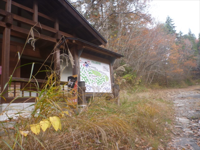 壊れた林道を登って休憩舎・駐車場に到着
