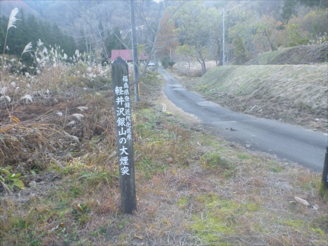 道標には福島県登録文化遺産軽井沢銀山の大煙突