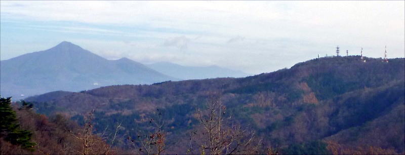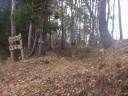 小田山公園車止めゲートを過ぎる。左(西)の斜面は既に黄葉を終えて落葉した樫類の樹林である。ダンプが通れるほどの巻道から尾根道にと、広い九十九折道の上に出た。まずは会津を鎌倉時代から400年支配した蘆名氏の墓地がある。この一帯は蘆名氏の小田山城があったところだそうだ。800年前からの道なりに進むと北西に会津若松城(鶴ヶ城)を見下ろす地点にでる。看板他によると「戊辰戦争では新政府軍の数基の砲が据えられた。城まで直線距離で約1.5㎞、当時の大砲でも砲弾が届いた」と解説してある。小田山公園には蘆名、松平、それらの家来衆、明治以降に出世をした子孫などにゆかりの大きな墓石や記念碑も立っていた。会津若松市民が散策を楽しみ郷土の誇りを感じる公園だそうだが思えば物騒である。残念な事だが小田山城址の標杭が倒れたままになっていた。道が細くなる。