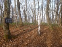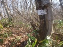 小田山から奴田山へ向かう。ダンプが通れるほどに広い道は既に終わっているがしっかりした踏み跡が尾根筋を南へ伸びる。分岐が出てきた。地形図は頼りになるか? 徒歩道と分かれて尾根筋の境界標・杭とテープに従う。薮を踏んで徒歩道に合流した。やはり里山は地形図に記してないコースが主流だ。地形図に頼りすぎないこと、この後は尾根筋の徒歩道を素直に登る。分岐にまた出くわした。「ヒメシャガ群生地・青木山・奴田山」と標識が3つもある。久曾神さんの計画書どおり奴田山に向かう。青木山とは何だろう。奴田山のこちらなのかあちらなのか、調査不足を悔やむ。次の分岐には「子供の森スキー場・青木山」と道標が立つが「小田山」がない。尾根を道なり進むとクマ除けの一斗缶がぶら下がる。久曾神さんがガンガン叩いた。落ち葉道を進む。「山頂周回コース」との案内標があり分岐になる。「妙見様案内」という道標もあったが奴田山はどこなのだろうか。