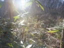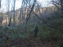 高尾嶺山頂に着くことができた満足感とこれ以上の苦労はないとの脱力感とが募る。落葉したミズナラ林の中、笹薮の小さな空き地でともかくテルモスの暖かいコンソメスープと薄皮餡パンで活力回復を図った。見回しても林の中で頂上稜線以外の展望はない。風がなく柔らかな日差しがあるのが幸いだ。黄葉の囁く音しか聞こえない。三角点から稜線を北に向かい北斜面へ下ることにした。稜線はやはり薮、薄いところを探して進む。7分掛かって行政境界が西へ曲がる稜線分岐地点についた。廃道を目指して北尾根に下る。北尾根の広葉樹林の笹薮を漕ぐ。落葉松林との境は笹薮が薄い。GPSL標高800mになると落葉松林との境の薮は笹が消え灌木になった。薮の灌木を掴み、一歩一歩滑りを止めて下る。落葉松林の先に杉林が見えてきた。直下降は滑落だ。地形図では読めない沢筋を越えて落葉松林へ向かう。蔦・蔓の邪魔を振りほどいて落葉松林から杉林に入り赤テープを見つけた。廃道に下って一息つぐ。三角点から標高差約100mを下るのに約30分もかかっていた。登るときに廃道をもう一尾根進んで落葉松斜面を目印にすればよかったと悔やむ。あとは赤テープを探して廃道を東方向へ踏み跡を辿る。廃道も所々が崩落個所や密薮になっている。苦労したが谷間から北会津の山々の黄葉と白い飯豊を望んで愛でる余裕ができた。登りに取り付いた峠を通って萱場に帰って来た。軽トラ道はすぐそこである。堰堤の端に着いたので大谷地溜池を覗いてみた。水は少ない。引き返して軽トラ道を廃屋前へ久曾神さんを追いかけた。2時間15分かかったが高尾嶺を無事に往復できた。なんでこんな薮山が会津100名山の一つなのだろうか。