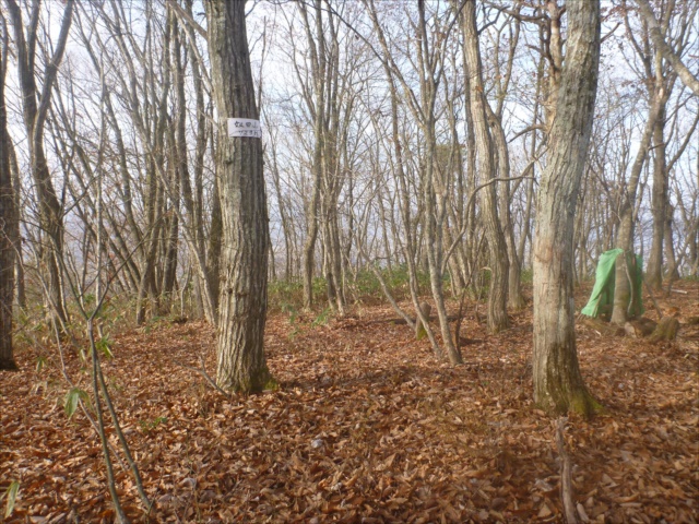 奴田山山頂到着山頂標と風よけ小テント小屋がある