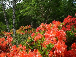 ![]() (あずまやさん) 2354m ![]() 【山行記録】 鳥居峠から歩かずに済んだため1Hの時間短縮。林道終点 の広い駐車場で準備。雨は降っていない。カラマツ、ミズナラ、 コメツガなどの林の中にウグイスやヒガラの声を聞きながら高 度を上げて行く。やがて展望が開け花童子宮跡に着く。この辺 りから高山植物が豊富になる。 サラサドウダン、イチヤクソウ、グンナイフウロ、イワカガミ、 マイズルソウ、ハクサンチドリなどなど挙げたらきりがない。頂 上からの眺めも素晴らしい。遠くは妙高山から槍ヶ岳を始めと する北アルプスの山々、振り返れば草津白根山や榛名などが 見渡せる。圧巻だったのは下り。新緑に白い幹のダケカンバ樹 林内に鮮やかなオレンジ色のレンゲツツジがこれでもかと咲き 誇っていた。梅雨の合間の山行で、これだけ恵まれれば言うこ となし。 (記録=Ta/K) ←咲き誇るレンゲツツジ |