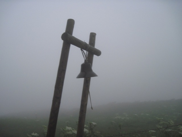 大朝日小屋の鐘も靄の中 縦走二日目の始まりです