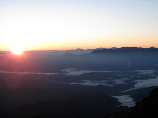 ![]() 26日二の池本館の先から見たご来光 右端に富士山 |