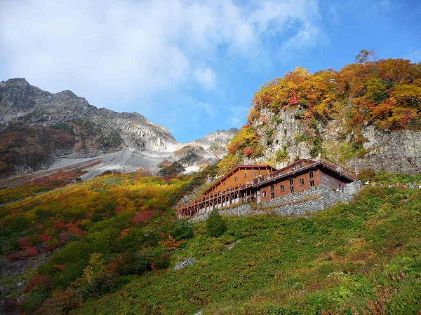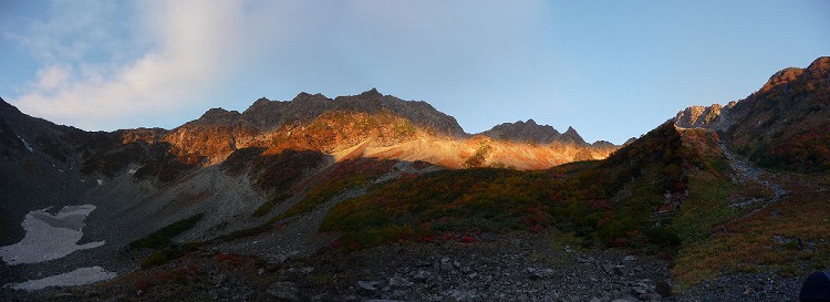 今年の紅葉は遅れていて、私達が涸沢 に入った時が一番のピークとなりました。 緑濃い上高地から入って、本谷橋を渡っ たあたりから紅、黄、朱に彩られた木々が 目に飛び込んできて、思わず歓声があが ります。 涸沢の朝。穂高や涸沢槍の稜線を染めて モルゲンロートが輝く。移ろい行くその光は 周囲の山々を照らしながら、やがて空の青 へと同化してゆきました。 北穂高岳の山頂では大展望が待ってい ました。奥穂、前穂、槍は言うに及ばず、 薬師、黒部五郎、笠、燕、常念、金峰、 そして富士・・・。 山座同定に浸って幸せ なひとときでした。 (記・YS) ←紅葉に染まる涸沢小屋 |