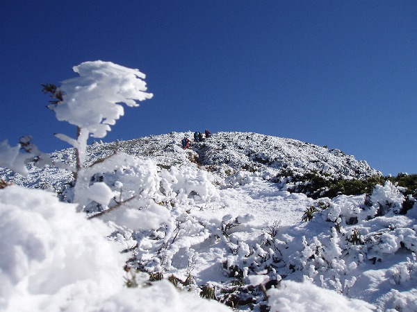 2010年12月19日(日)前夜発 【メンバー】 CL:AY SL:MS IS YS SK ES (計6名) 【コースタイム】 起床5:50→唐沢鉱泉発7:40→枯尾ノ峰分岐9:00→ 第一展望台10:15→第二展望台10:50〜11:05→ 西天狗岳11:55〜12:20→東天狗岳12:40〜50→ 中山峠13:35→黒百合ヒュッテ13:43〜14:00→ 渋ノ湯分岐14:30→唐沢鉱泉16:00 ←西天狗岳の頂上はもうすぐ |