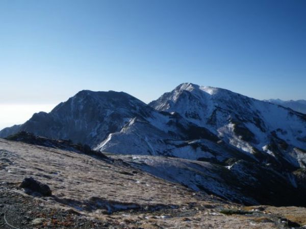 進行方向に杓子岳と白馬鑓ヶ岳