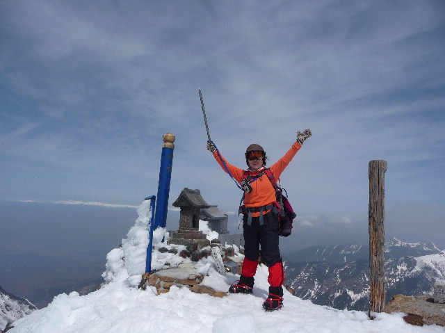 18_ついに山頂、ばんざーい 後ろに北アルプスが白い線のように見えます。