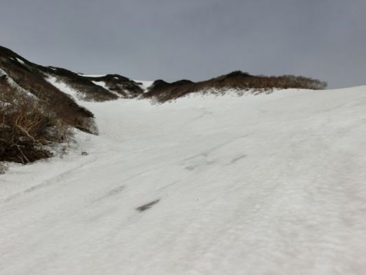正面左の雪渓から分水嶺に上がる