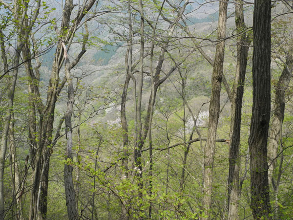 林後しに見える新緑とヤマザクラノ風景