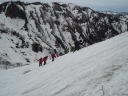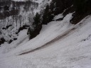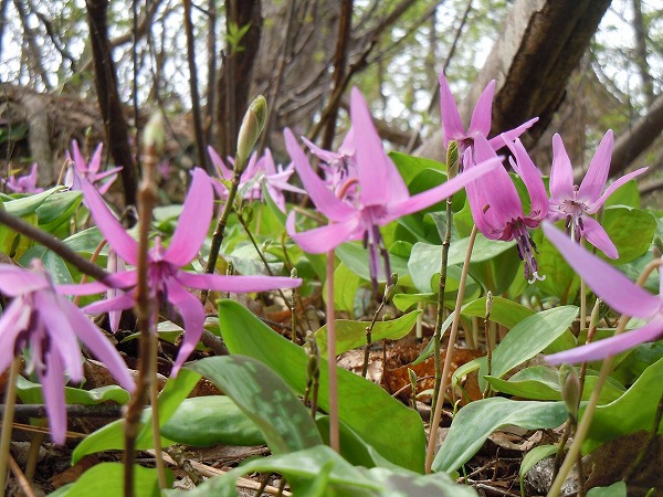 | 【コメント】 白山の北に位置し、残雪の時期しか行けない奥深い山。3年越しにリベンジしました。1回目は残雪が消えて密生するヤブに阻まれ、予定のテント場にも行き着けずに撤退。2回目は悪天予報で断念。今回やっと山頂に立つことができました。 連休の大荒れの天候の間隙にうまくはまって、豊富な残雪に助けられて、四囲の高峰の山並みを眺めながら、快適に歩けました。往路にとった山毛欅尾山(ぶなおやま)ルートは長くて、途中で幕営が必要なため、人気が薄れたのか誰にも会わず、、テント場も単独行の男性1人だけでした。 復路は、今は多くの人がピストンするというジライ谷を下りました。とはいえ、細い急峻な登山道が延々と続いて気が抜けず、次々と現れる長いトラロープや木の根にに頼らなければ転げ落ちかねないほどでした。 予期せぬアクシデントもありました。山頂からの下山時、1640mピークで、仲間が突然動けなくなりました。携帯電話も通じず、ビバークを覚悟しましたが、幸い、唯一出会ったツアーのガイドさんに下山途中の通報を頼み、予想より早く飛来した県警ヘリに救助されました。診断は肉離れとアキレス腱上部の一部断裂でした。多くの好条件が重なって、ラッキーな結果となりましたが、このような場合にどう対処すべきか、とても考えさせられました。 笈ケ岳の魅力的な山容、山毛欅尾山への途中と下山口近くで出会った斜面一面のカタクリの群生に疲れも吹き飛ぶ心地で、心に残る山の1頁がまた増えました。 (記:YS) |
