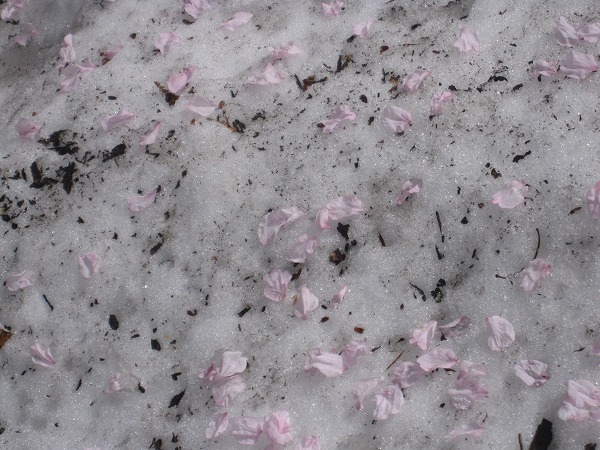 残雪の上に舞い散った桜の花びら