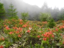 道沿いにレンゲツツジが色鮮やかに咲いていた。熊笹が引き立て役となり一層映えて見えた。