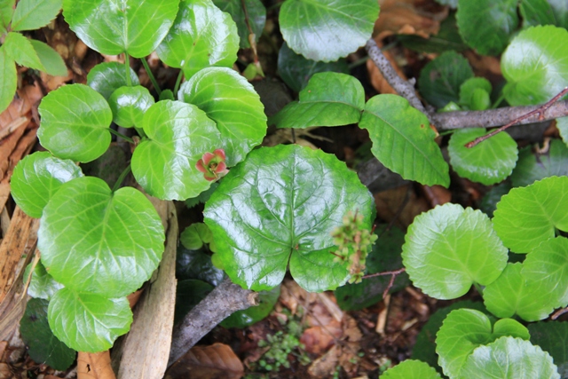 左の葉がイワウチワ、右の葉がイワカガミ