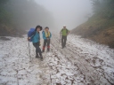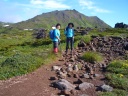 【日程】2012年7月12日(木)〜17日(火) 【参加者】 L:KY、SL:MS、ES、TN(会員外) 【コースタイム】 14日 ≪トムラウシ登山≫ 東大雪荘(トムラウシ温泉)発3:40⇒新登山口発4:00→カムイ天上5:00 →コマドリ沢6:40 →前トム平7:40→縦走路分岐9:00→山頂着9:30 発9:55→コマドリ沢12:00 →新登山口着14:20 16日 ≪十勝岳登山≫ 白銀荘発4:30→分岐5:10→避難小屋5:40→昭和噴火口6:45 →山頂着7:45 発8:05 →避難小屋9:20→白銀荘着10:20 【コメント】 ≪トムラウシ登山≫ 雨予報の続く第一目標の幌尻岳をあきらめ、進路変更。トムラウシ温泉に着くと、大量遭難の起こった日から3年目となる週末なので、警察・報道関係の方が大勢いて登山者に注意喚起やインタビューをしていた。まさかその時の私のコメントが住所・名前入りで翌日の北海道新聞に掲載されるとは! 朝のうち時々小雨が落ちたが、しだいに回復してきた。コマドリ沢までは、まるで田圃のような泥路と笹薮とのアップダウン。雪渓を登ると稜線に出、花々に励まされながら這いマツ帯や岩稜帯を過ぎた後、トムラウシ公園というお花畑が広がり庭園の様な雪の残る穏やかな湿地帯に下る。分岐からは溶岩のガレ場の急登をひと登りして、全国からの登山者で賑わう狭い山頂着。日高・十勝方面も眺められ、北海道の奥深さを感じる。岩塊の続く下りでナキウサギと出会う。慌てて撮ったのでピントが合っていなかった。トムラウシ山は長く変化に富んだ山だった。気力・体力の限りを尽くして、悪天候の中無事温泉にたどり着いた3年前の登山者を思い、山の怖さを改めて考えさせられた。 ≪十勝岳登山≫ キャンプ場の上からほぼ平坦な道が続き、川を渡渉して岩が積み重なる這い松の登り道を進むと、狭い高みに「九条武子歌碑」があった。見通しの良い礫地帯は気をつけないと迷いやすい(実際下りでちょっとウロウロ)。望岳台からの分岐から本格的な溶岩帯の登りとなり、避難小屋に到着、一休み。振り返ると美瑛方面のパッチワーク畑が少し見下ろせる。ここからはまるで阿蘇山を登っているような、荒涼とした火山の様相となる。右手には、対照的にグリーンの美しい富良野岳が見える。昭和噴火口まで上がると美瑛岳への稜線も眺められ、雄大な空間が広がる。砂礫と崩れやすい岩の道を登り山頂着。二日前のトムラウシ方面も望める。下山にかかったとたん、あっという間に山頂付近に雲がかかり、前十勝方面の噴煙がくっきりとたなびいていた。数日前まで有毒ガス発生のため登山禁止となっていたが、登れてラッキーだった。思った程時間がかからなかったので、チャンスがあれば富良野岳から上ホロ避難小屋に泊まり、景色を楽しみながら縦走してみたいと思った。 (記録=KY) |