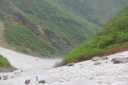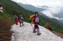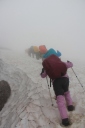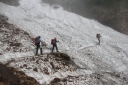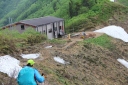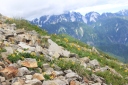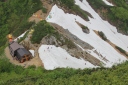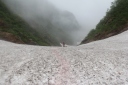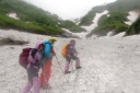 7/14(土)1日目 7/15(日)2日目 昨日の雪渓の急登も緊張しましたが、今日は針の木岳への雪渓の急なトラバースがあり、緊張の出立です。 |