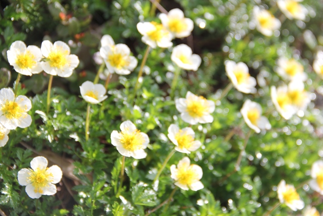 朝日に輝くチングルマの群落