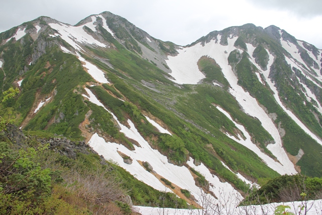 針木岳への雪渓の急傾斜のトラバース道が見える