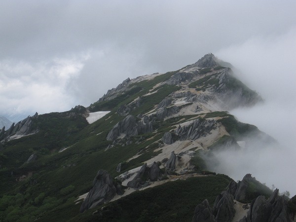 一瞬ガスが切れて振り返ると、燕岳が美しい姿を現しました