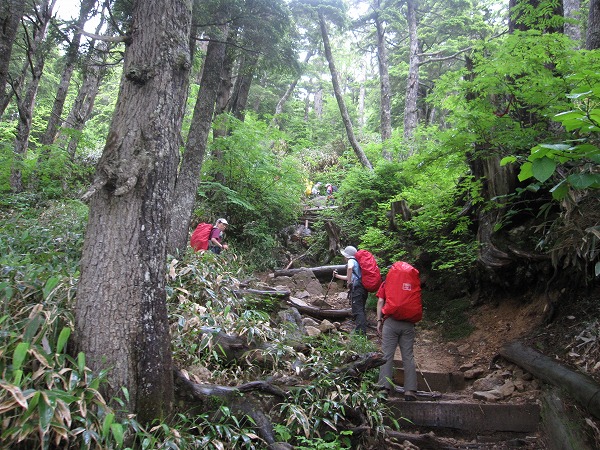 合戦尾根の樹林帯。登るにつれ登山者でじゅずつなぎとなりました