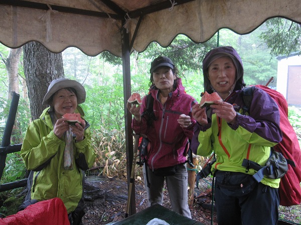 合戦小屋で名物のスイカを分け合って。甘くて冷たくて美味しい!